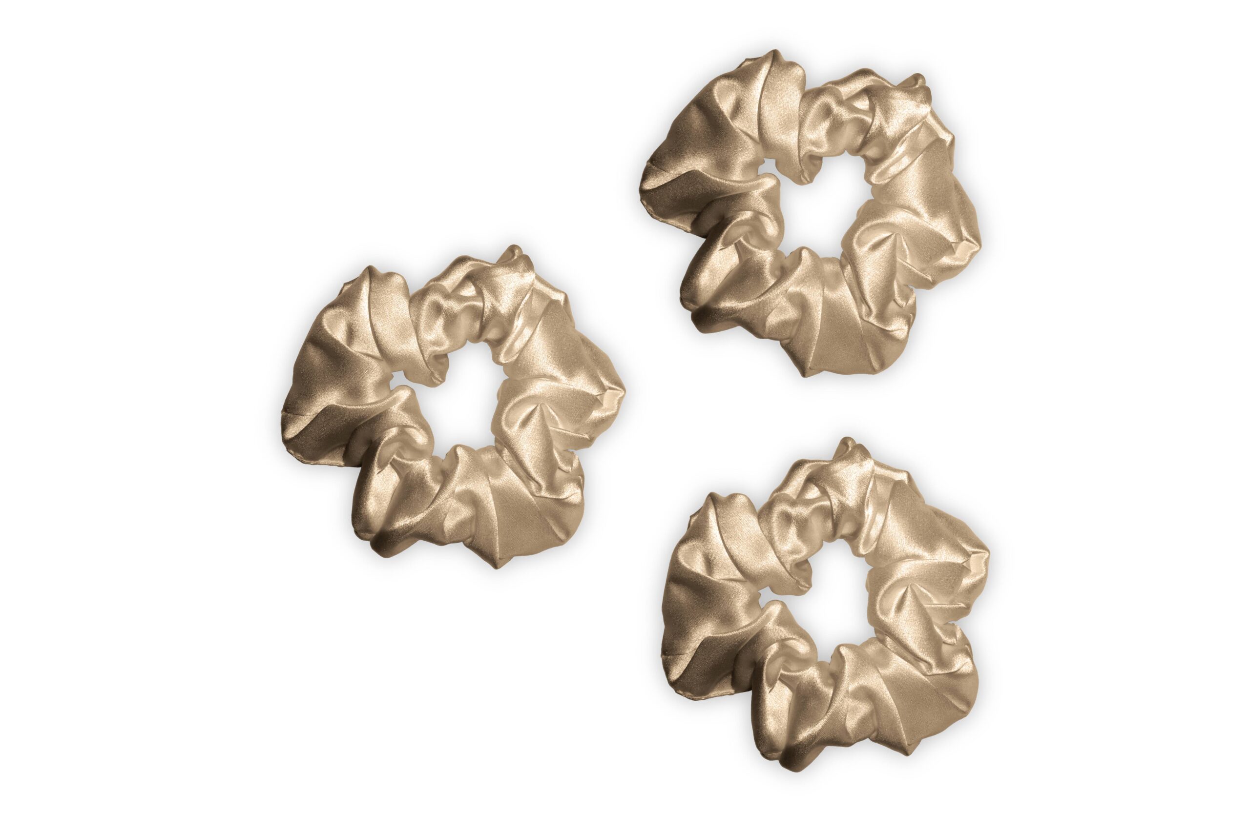 Set of three luxurious 19mm mulberry silk scrunchies. Soft, breathable, and hypoallergenic, it reduces friction and and helps prevent hair breakage.